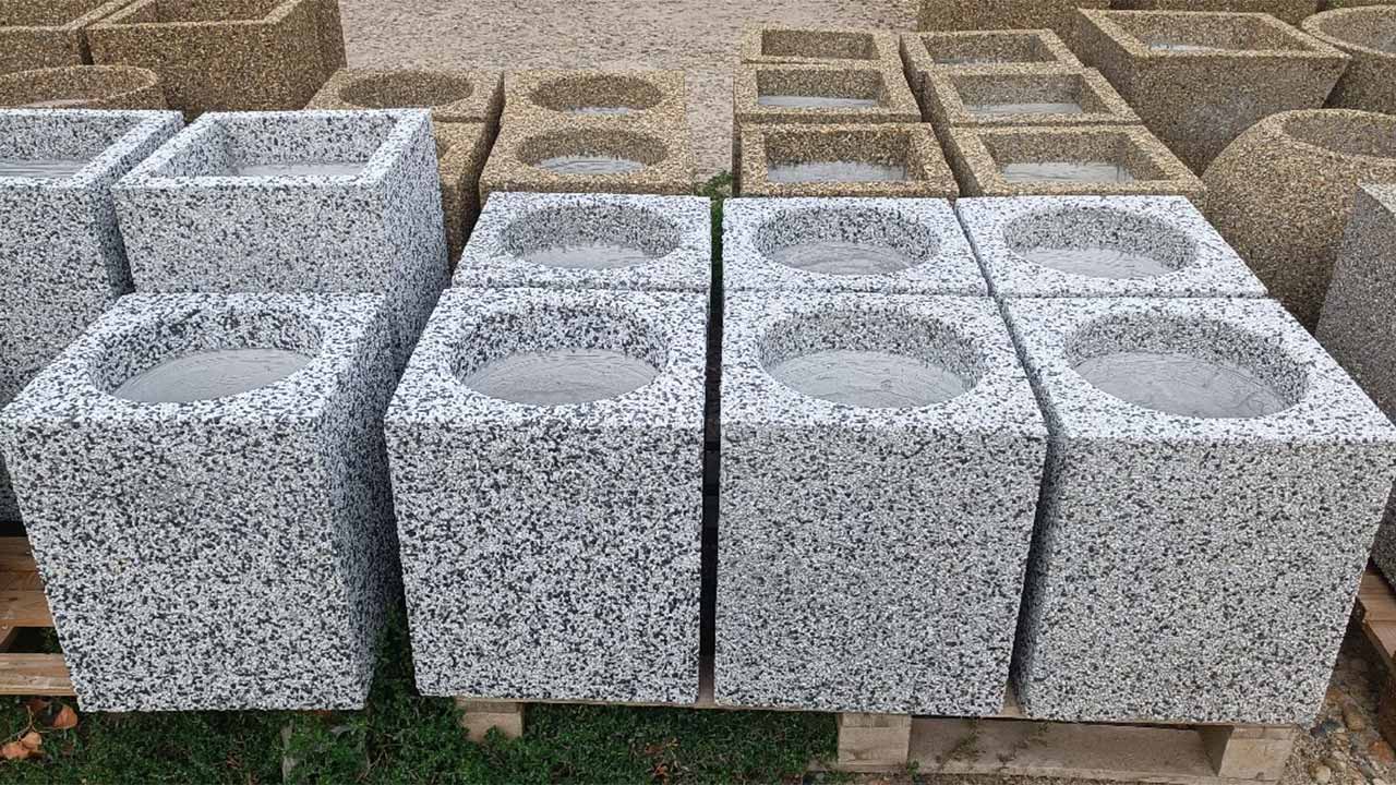 «Квадро урна» изготовлена из архитектурного бетона, в основе которого лежит морская галька, гранит или мрамор.